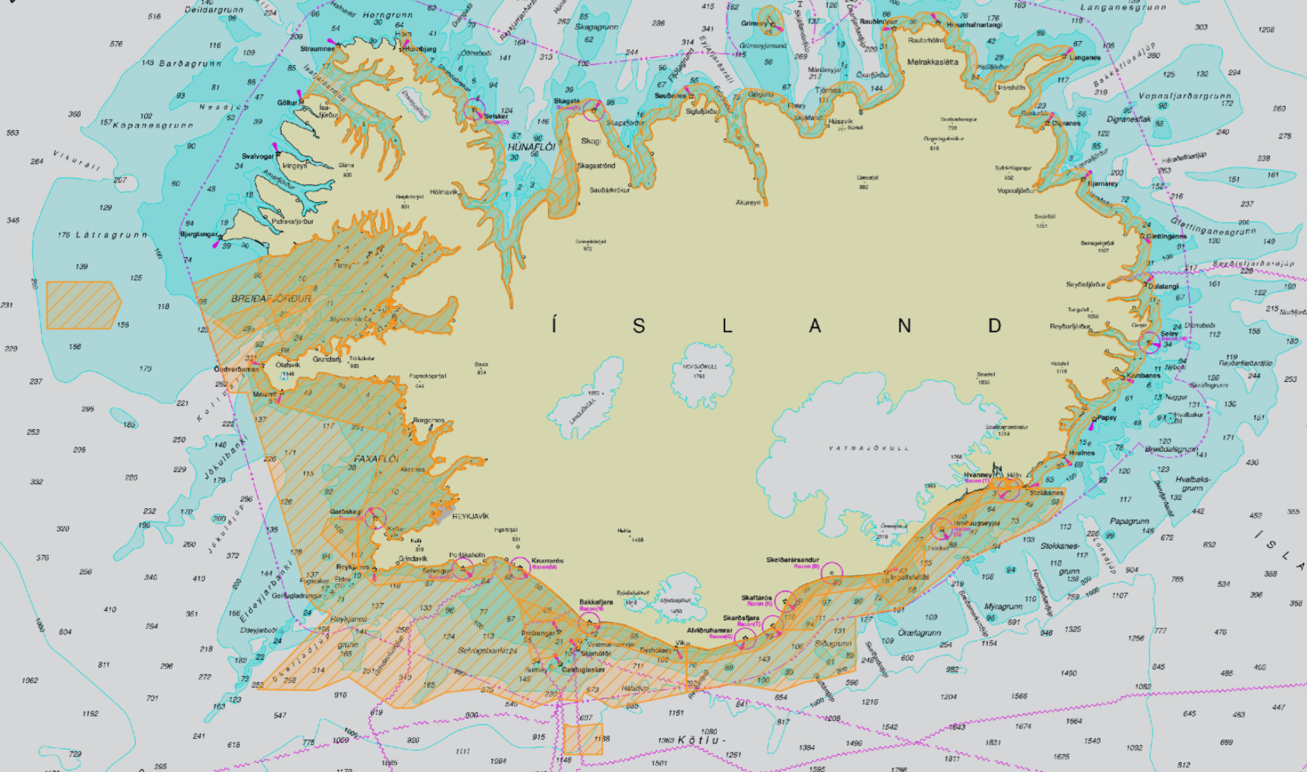 Farsæll hefur verið á veiðum á öðrum svæðum en venjulega frá því eftir páska vegna þess að svokallað hrygningarstopp hefur verið í gildi frá byrjun apríl, en þá er bannað að veiða þorsk, skarkola, blálöngu og steinbít innan skilgreindra hrygningasvæða, sem má sjá á myndinni hér að neðan (fengin á hafsjánni), gulmerkt. Hrygningarstoppi lýkur á morgun og þá getur Farsæll farið á veiðar á kunnuglegum slóðum aftur.